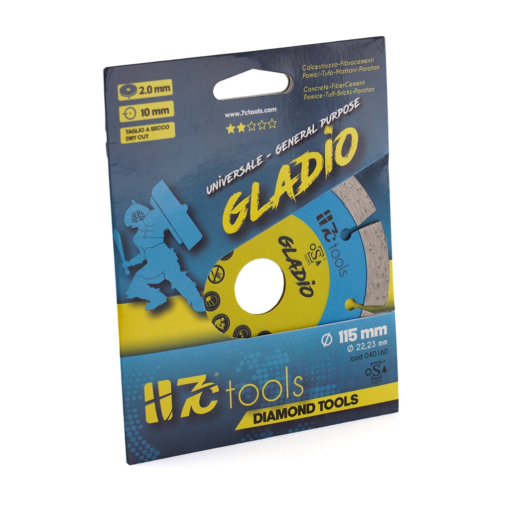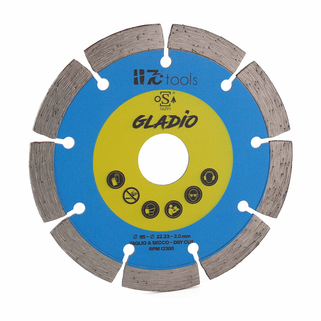 Gladio diamond cutting disc, 115 mm diameter, 10 mm diamond crown, 2.3 mm thickness. Ideal for cutting hard stone such as brick, concrete, pumice, tuff, poroton, fiber cement, marble.