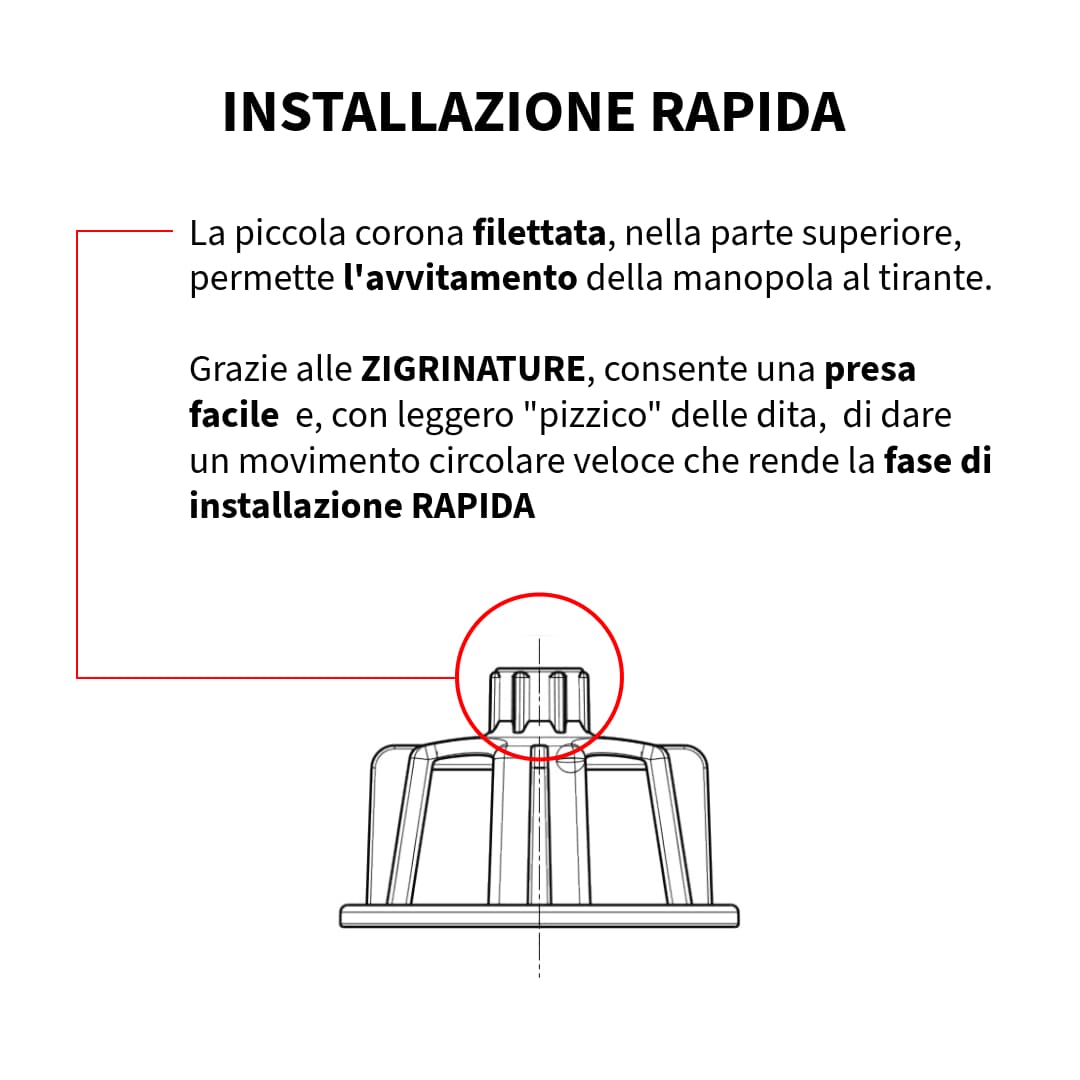 Con un design innovativo e brevettato, il T’ Plus migliora significativamente il processo di livellamento, eliminando la necessità di strumenti aggiuntivi e semplificando l’installazione con soli due componenti: un tirante e una manopola che si integrano perfettamente.